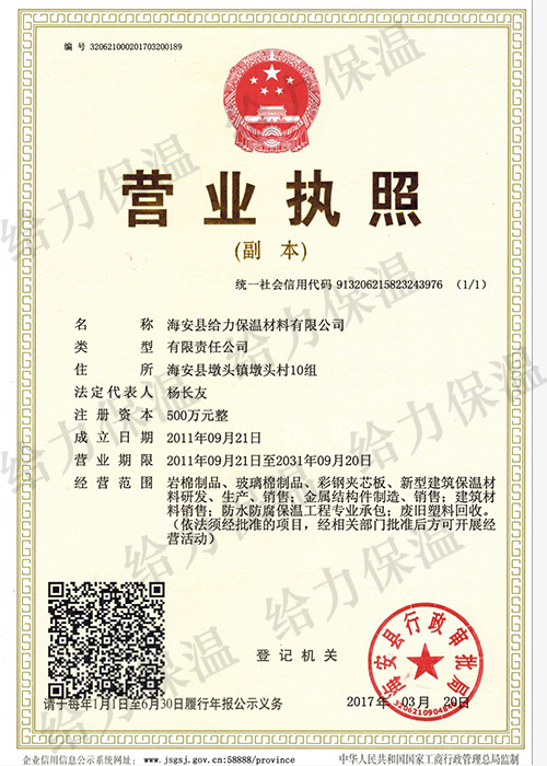 海安縣給力保溫材料有限公司(原海安縣創(chuàng)業(yè)保溫材料廠)成立于1990年。公司位于江蘇省南通市海安縣墩頭鎮(zhèn),占地面積20畝,建筑面積12000㎡。